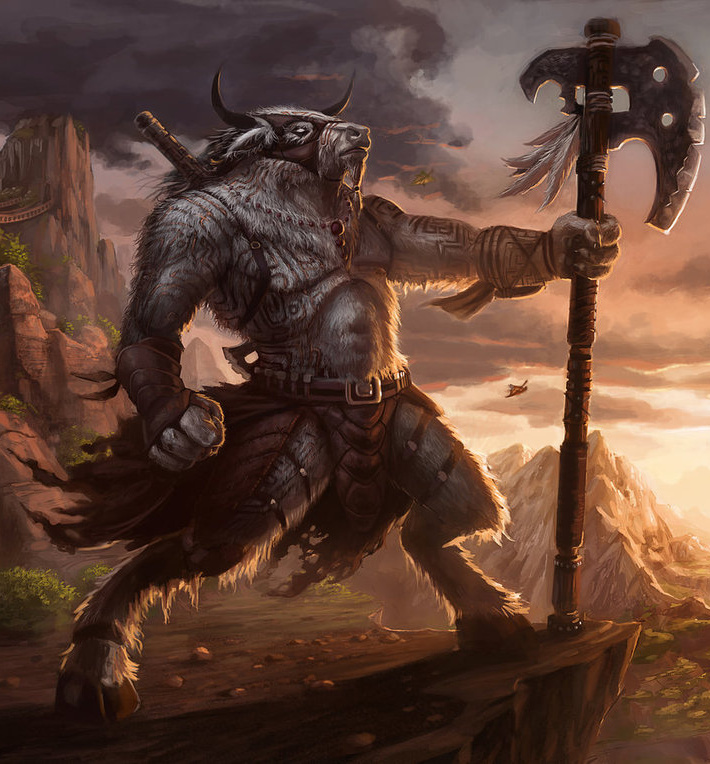 Minotaurs are a fair bit larger than humans and even most orcs. As chimeras, they represent a fusion of humans and bulls. All minotaurs have at least the head of a bull and a humanoid body. Minotaurs are a great deal stronger than humans, on average, and thus are proficient with heavier varieties of weapons.